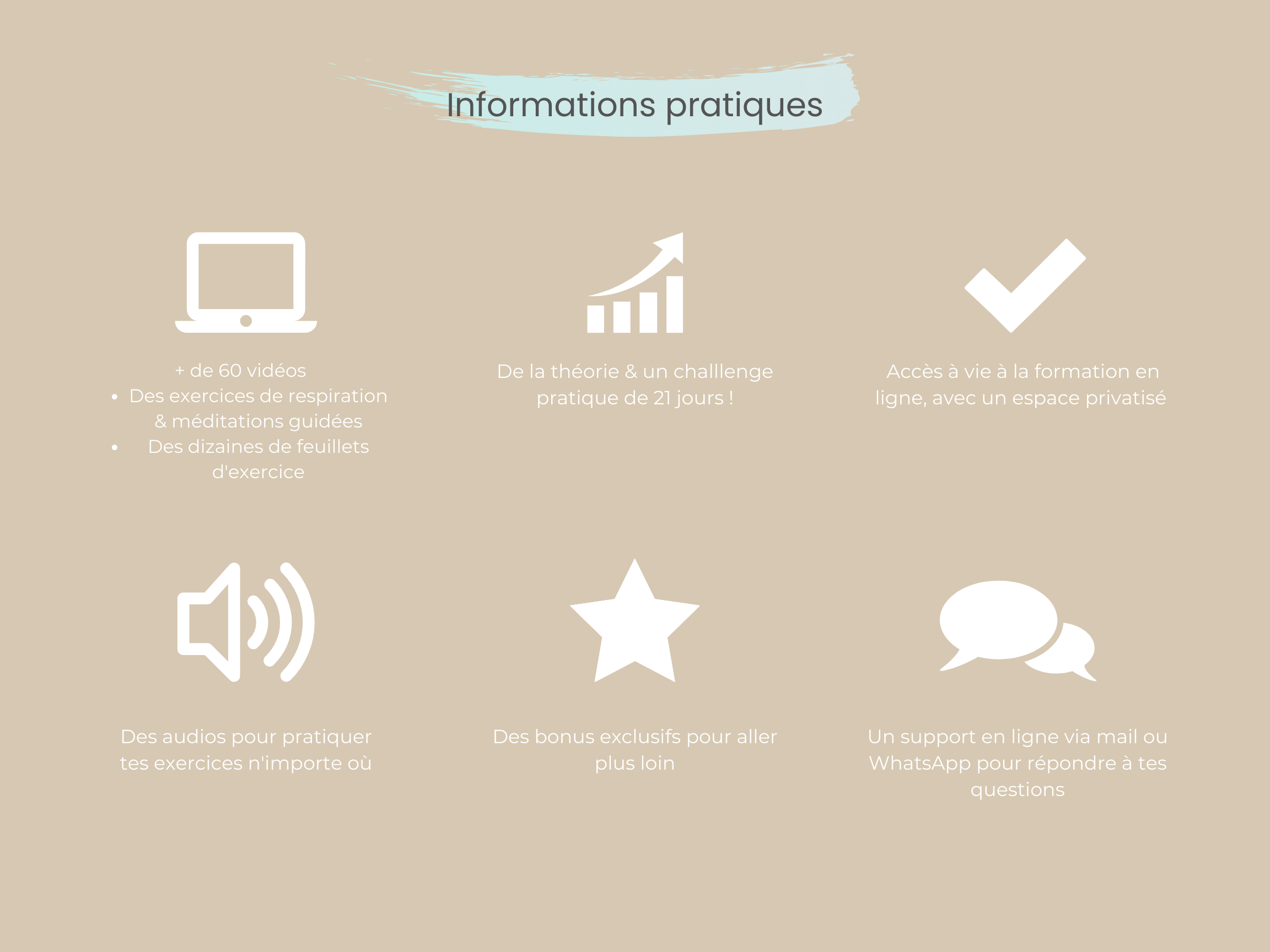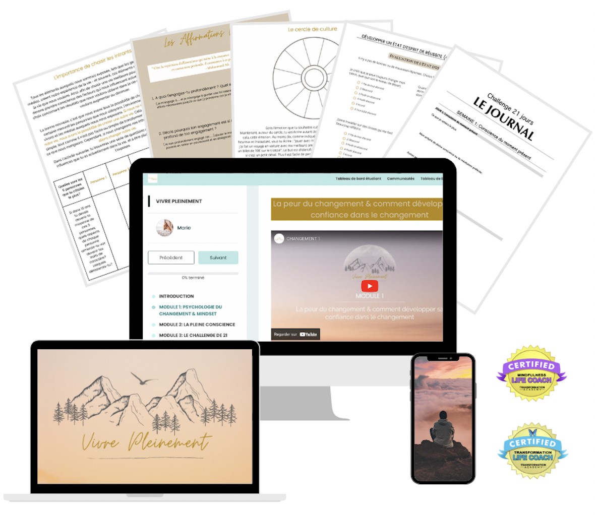 Ce mélange de développement personnel, pleine conscience et méditation, fait de ce programme un parfait allié pour t’aider à te libérer du poids du passé, de la pression de l’avenir et vivre le moment présent, sereinement et pleinement.